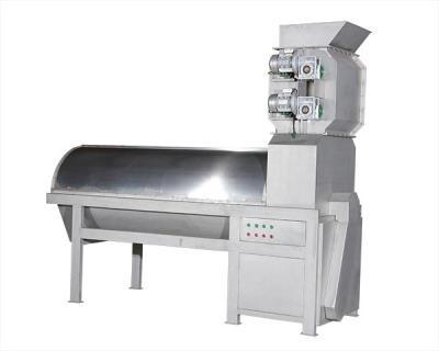 石榴從進(jìn)料斗進(jìn)入上壓碎裝置,上壓碎裝置將石榴壓開(kāi),下壓碎裝置再次將石榴擠壓,經(jīng)過(guò)兩級(jí)擠壓的石榴已基本皮籽分離,并落入分離裝置,石榴籽從篩孔落下,皮從尾部排出, 籽及汁用另配的螺桿泵送至下道工序。