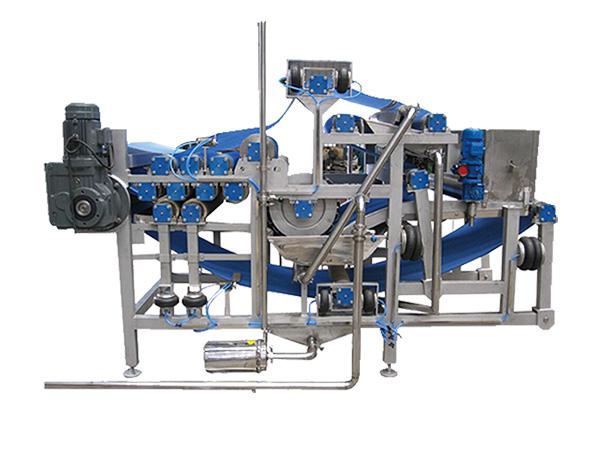 壓濾帶的清洗:采用鍥型(弧型)過濾篩自動過濾,排渣、配有高壓泵及噴射裝置,能方便地邊過濾邊清洗壓濾帶,該即具有良好的出汁效果,且節(jié)約能源。